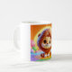 Um filhote de leão fofo com olhos cintilantes e um sorriso encantador, sentado em meio a uma cena colorida e lúdica.