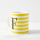 Letra F Mug com traços positivos começando com F contra listras amarelas.