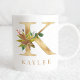 Uma caneca de café personalizada com uma falsa letra de ouro "K" monograma, com ilustrações decorativas de cor d'água floral e folhagem. Personalize-o facilmente com seu nome ou crie um presente único para seus entes queridos.