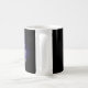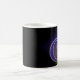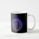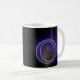 Mok met de letter O. (bijvoorbeeld je initiaal) Leuk als je naam met de O begint of die van een ander. Achter de letter is een raster en mysterieuze wolken met een licht die erop schijnt. De letter O is gevuld met een plaid patroon en een grijze rand erom heen. kleuren blauw, paars, geel en zwart.