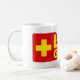 Mata salva-vidas. Chá e xícara de café com o logotipo amarelo e vermelho-salva-vidas vibrantes.