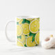 Um design de refrescamento e de Verão com um padrão uniforme de fatias e folhas de limão sobre um fundo branco nítido. Perfeito para comida e amantes da frescura da cidade!