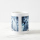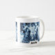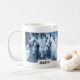 Uma caneca com uma fotografia de um par de cavalos amarrados juntos. Um dia de neve e um filtro azul criam uma cena mágica.