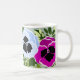 Arte vetorial de flores de pansias cor-de-rosa azuis e profundas cercadas por folhagem verde