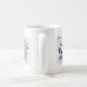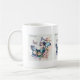 Uma caneca com trio de borboletas fluindo entre algumas flores bonito. Esquema de cor rosa azul e verde.
