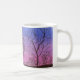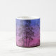 Uma pintura aquosa de uma velha cerca e árvores de outono silhuetadas contra os dedos e os azuis profundos da noite, o céu crepúsculo enfeita esta caneca.