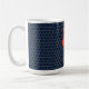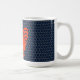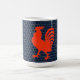 A red rooster struts across a chicken wire background on contrasting dark blue or black. Perfect for anyone who loves chickens and country-style motifs.