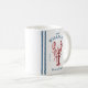 Lobster Costeira A caneca de café da Casa da Praia apresenta um fundo branco com um estilo de cor-de-água vermelha Lagosta de Maine e tiras de cordas azuis de marinho. Personalize-o com seu nome de família e a data estabelecida em uma fonte azul-marinho clássica. Perfeito para casas de praia de verão e casas de água.