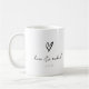 Texto manuscrito elegante e sotaques de pincel são usados para criar as peças deste lindo e moderno pacote de casamento. A caneca de café mostrada aqui em preto em branco, apresenta uma modelo para adicionar facilmente sua citação favorita, seus nomes e data de casamento. As formas cardíacas desenhadas à mão acrescentam um sotaque divertido adicional. Procure ID940 para ver todos os produtos neste conjunto de casamento.