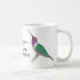 Caneca branca com Lúcifer Hummingbird pintado à mão. Você pode alterar o texto clicando em "Editar design".