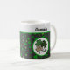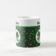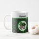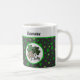 This fun monogrammed shamrock mug is great for Saint Patrick's Day, an Irish friend, or for anyone who likes shamrock themes. It includes three shamrocks with varying prints, including a primarily green print, a black print, and a "big cat" leopard animal pint, in a circle of white. The background is a pattern of green shamrocks against black, with green trim. Your monogram name appears at top in a vintage typeface against white so make sure to type the name you want. The design is on both sides of the mug.