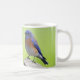Uma caneca com duas imagens de um pássaro azul ocidental masculino. As imagens são duplicadas para que haja dois pássaros azuis na xícara - é o mesmo pássaro. Há uma ligeira diferença de tom entre as duas imagens do pássaro azul devido à diferença de fundo.