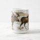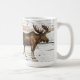 Uma linda caneca de vida selvagem com um alce, sobre um fundo de madeira descascada e curvada. A xícara de café ideal para o amante do país rústico!