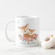 Desenho doce de uma mãe e de um veado bebê em um toco de árvore com flores e borboletas verdes.