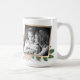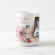 Uma caneca de presente, por hábito, para a mãe de uma filha. Adicione uma foto de mãe e filha e personalize o texto. O texto de exemplo é "Mães e filhas são amigas para sempre". Bonito flores cor-de-rosa decoram uma caneca de café branca.