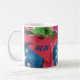 padrão de abstrato com vermelho vívido e espirais azuis de cor. Esta caneca de café tem um lugar para o seu monograma.