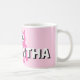 A caneca da criança personalizada com coruja engraçada e nome para a garota. Boa ideia para o aniversário das crianças. Design de caneca personalizada com pequenos mascotes de desenho animado. Cor de fundo rosa-cinza personalizada.