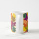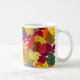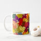 Esta caneca tem um design de uma pilha de folhas em verde, amarelo, laranja, azul, marrom e vermelho em um campo de amarelo pálido.