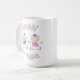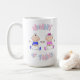 Uma caneca de café branca com "Mamães de Gêmeos" em um menino e menina azul e fofo, de roupas azuis e cor-de-rosa.
