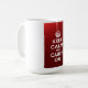 Uma caracterização da caneca mantem a calma e continua o slogan no texto colorido branco e no fundo vermelho de incandescência