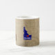 Um mapa de Idaho, com uma textura de pele de batata sobreposta a uma imagem de fundo de burlap. Um mapa da silhueta azul com leitura de texto, "I (um coração vermelho) IDAHO" também é exibido. Personalize adicionando seu próprio texto adicional no lado oposto. Uma maneira simples de mostrar seu orgulho de Idaho.