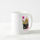 Uma caneca de café com uma ilustração gráfica com marcos europeus, como torre inclinada de Pisa, Big Ben, Torre Eiffel, etc. Um balão de ar quente no céu e um ônibus de dois andares, com uma grande câmera. Um selo com as pirâmides egípcias presas à câmera.