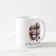 This ceramic coffee mug is shown with Mardi Gras images, Text of "Let the good times roll' is beneath the prints.