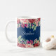 Esta caneca personalizada apresenta um design floral moderno com flores e folhagem cor-de-rosa e arrojadas sobre fundo azul marinho com letra de escrita. Personalize-o com um nome.