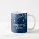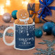 Luzes de cordas marinhos azuis e brancas acendem canecas de Natal com um design de diversão engraçadinho com nome de família para uma temporada festiva de Férias.