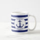 Esta caneca do tema náutico possui uma âncora com uma borda circular de corda. A palavra "Capitão" está acima e abaixo é um nome para você personalizar. O fundo é marinho azul e listras brancas.
