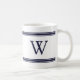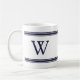 Marinho de monograma, caneca personalizada listrada e riscada. Monograma azul marinho em texto de bloco clássico dentro de painéis externos marinho com faixa azul. Fundo branco.