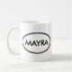 Verifique para fora esta caneca de Mayra! É seu nome Mayra? Ou você tem uma esposa, um namorada, um membro da família fêmea ou um amigo fêmea nomeados Mayra? Em caso afirmativo, esta "caneca do selo conhecido" é exatamente o presente que você está procurando! As características de design "Mayra" na rotulação preta grande cercada por dois ovals, um fino e um grosso.