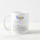 Uma caneca engraçada para o seu chefe com o logotipo de "busca do chefe" e um resultado de busca de solteiro para "O melhor chefe de sempre", com o nome do seu chefe, sua mensagem pessoal e uma classificação de 5 estrelas.