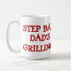 Imagem engraçada de CHURRASCO no fogo, cozinheira em pânico e humorística "PASSO DE VOLTA... PAI GRILLING!" citação. Presente de aniversário de pai, Dia de os pais ou presente de Natal bonito e divertido. Uma caneca legal e original para o maior pai do mundo e o melhor (ou pior) cozinheiro.