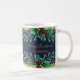 "Feliz Marinho de natal, Dourado Red Watercolor Coffee Mug." "Feliz Natal" está na caligrafia de script com seu nome de família ou mensagem abaixo. As folhas, folhagem e bagas pintadas à mão de uma aquarela são combinadas com elementos verdes feitos à mão com uma brilha dourada sobre um fundo azul marinho profundo. Arte de uma artista internacionalmente licenciada, Audrey Jeanne Roberts, copyright.