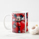 Um doce e divertido design de caneca com o rosto sorridente de Minnie Mouse cercado por corações e estrelas. As cores suaves e o estilo cartoonista criam um sentimento alarmante e nostálgico.