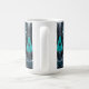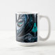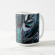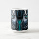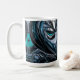 This striking coffee mug features a modern side-profile portrait rendered in shimmering deep teal, cyan, black and silver metallic tones. The stylized face seems sculpted from liquid metal, with smooth curves, sharp graphic lines and glossy highlights that catch the light like a futuristic mask. The cool teal accents add a mysterious glow, while the dark metallic shadows give the design depth and drama.