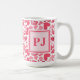 Modern mug featuring a pink and red Valentine's hearts pattern, with a custom monogram overlaid in modern fonts in matching pink. A romantic, personalized gift ideal for Valentine's Day or special occasions.