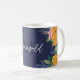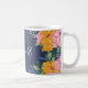 Pretty monogrammed coffee mug printed with your name and monogram. It'll be a delight to drink coffee or tea from this personalized mug, the flowers yellow and pink and framing your name in a thin script and your initial beneath against a dark blue background. This coffee mug is perfect as a gift on Mother's Day to your mom or grandma!