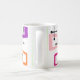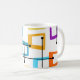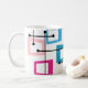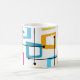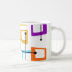 Esta caneca tem um design de retângulos que são esticados em uma extremidade em cores ranhuras, laranja, verde, lacre, roxo, azul, rosa e amarelo com linhas atômicas que os cruzam.