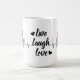 Comece seu dia com positividade e alegria com esta clássica caneca branca, com a citação do eterno "Ao Vivo, Ria, Amor." Este design simples, mas inspirador, serve como um lembrete para abraçar os momentos preciosos da vida com um coração alegre. Feito de cerâmica de alta qualidade, é perfeito para tomar café matinal, chá ou qualquer uma de suas bebidas favoritas. Seja para si mesmo ou como um presente pensativo, esta caneca te encoraja a viver plenamente, rir com frequência, e amar profundamente, todos os dias. Uma adição encantadora a qualquer cozinha ou espaço de escritório.