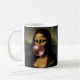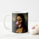 Uma representação engraçada de Mona Lisa soprando uma pastilha elástica rosa
