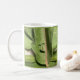Uma caneca de lagarta monarca com uma fotografia única da lagarta e três círculos que comeu, que se assemelham a um rosto feliz numa folha. Para personalizar o texto de edição para adicionar nome ou personalizar de outra forma.