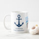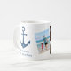Aproveite sua xícara de café neste conjunto de temas náuticos com uma âncora azul marinho. A caneca pode ser personalizada com um monograma, nome ou frase de um lado, e quatro fotos do outro lado.