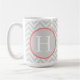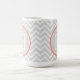 Aproveite seu café ou chá com uma caneca de café Coral Chevron Monograma. Design de caneca de café apresenta um padrão de fenda de cinza leve com um emblema circular esboçado em coral. Itens adicionais disponíveis com este design também. Entre em contato comigo diretamente para obter assistência com a personalização.