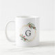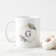 Adicione alegria festiva ao café, chá ou cacau da manhã com esta caneca elegante de férias. Design apresenta o seu monograma inicial solteiro em caracteres clássicos, rodeado por uma falsa borda geométrica de folha de ouro, acentuada com amoras de cor vermelha e folhagem botânica verde. Projetado para coordenar com a nossa coleção de férias Gemstone.