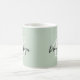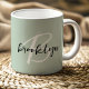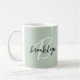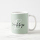Esta elegante caneca de café personalizada apresenta um monograma e primeiro nome em uma escrita moderna em preto e branco sobre um fundo verde sábio.