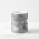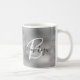Esta elegante caneca de café personalizada apresenta seu monograma e primeiro nome na moderna escrita de cinzas brancas e carvões, sobre um fundo cintilante de folha de prata e brilho.