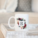 A caneca do monograma floral chico apresenta o seu monograma inicial solteiro rodeado por flores aquáticas e verde-luxuosas em tons de joia de marsala, rosa-pincel, azul-marinho e verde-eucalipto.