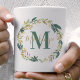 A natureza elegante inspirou um design de caneca de café personalizado que apresenta uma bela camada verde de aquarela com verde neutro, ouro e folhagem e flores coloridas de creme. Personalize com o nome do monograma personalizado e inicial. Faz um presente de excelente para as damas de honra e outros membros da sua festa noiva.